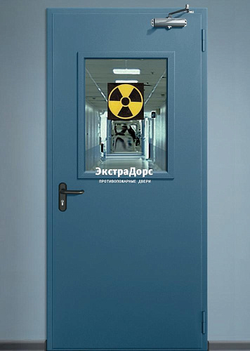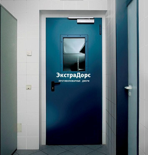 Противопожарная дверь 1 типа синяя c выпадающим порогом с остеклением