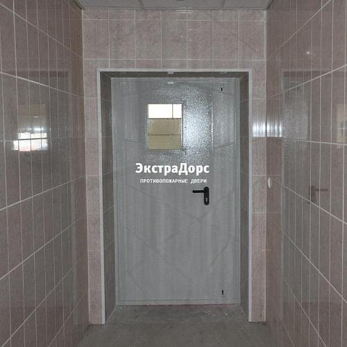 Двухстворчатая огнестойкая дверь EI 60 с выпадающим порогом и стеклом