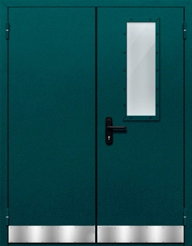 Противопожарная дверь EI 90 голубая двухстворчатая со стеклом c выпадающим порогом