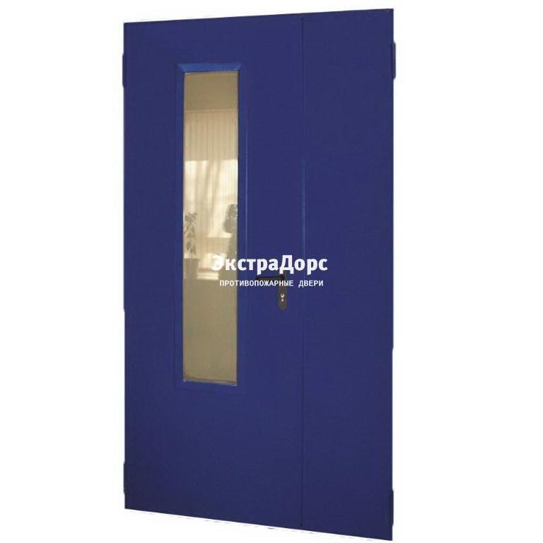 Дверь с выпадающим порогом противопожарная EI 90 двупольная синяя со стеклом в Ивантеевке