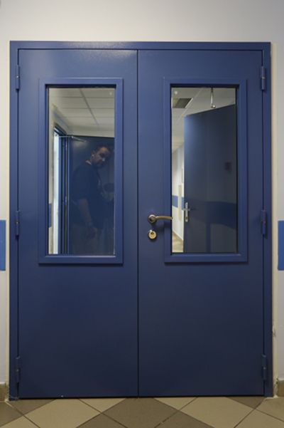 Противопожарная алюминиевая дверь синего цвета в Ивантеевке