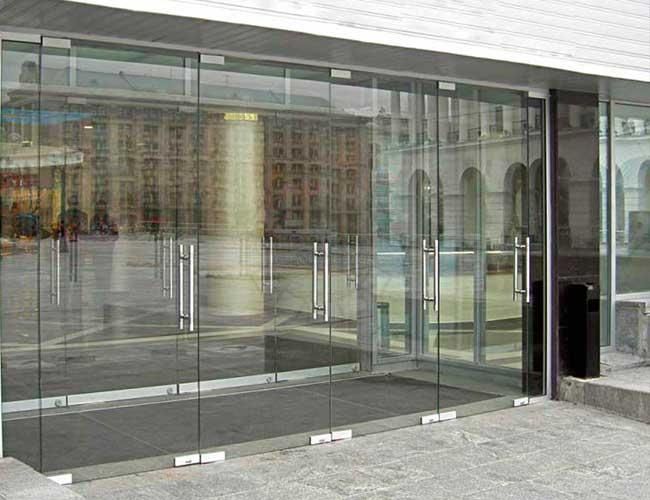 Противопожарная безрамная дверь со стеклом в торговый центр в Ивантеевке